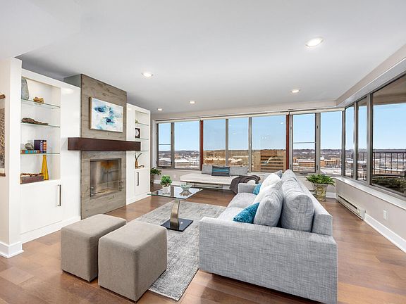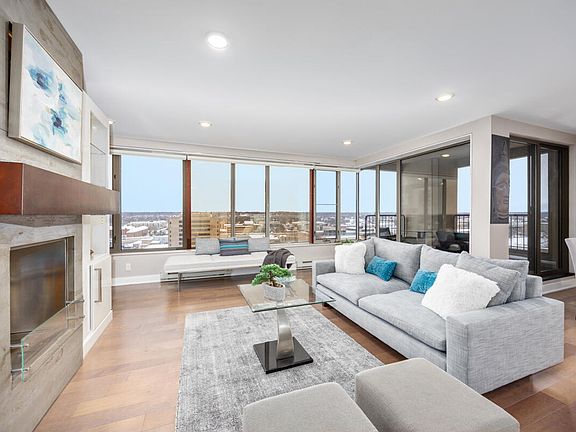 Experience the downtown lifestyle you've been dreaming of in this contemporary 15th-floor corner condo at The Plaza Condominiums. From the moment you enter, you're greeted by breathtaking, panoramic views thru 35 feet of wrap-around glass. Look north for sweeping views of the Grand River, or west for picture-perfect sunsets over the river, GVSU, and the iconic Blue Bridge. This light-filled, 1-bedroom, 2-bath residence offers 948 sq. ft. of meticulously maintained living space with thoughtful, high-quality upgrades throughout. Sleek, modern design is paired with a hint of brutalist cool for a space that feels both refined and architecturally striking. The open kitchen features clean white and mahogany custom cabinetry with slow-close drawers (some with auto-openers), crisp hard-surface countertops, and a fully tiled backsplash of clear-tinted stacked subway tile. High-end appliances—including Sub-Zero, KitchenAid, Gaggenau, and Fisher & Paykel—make both cooking and entertaining a joy. The living and dining area is drenched in natural light, with sliders to an enclosed balcony-your perfect spot for morning coffee or evening cocktails overlooking the Grand River. A standout feature of the living room is the working ethanol fireplace: a custom brutalist concrete surround with a floating mahogany mantel that echoes the room's architectural concrete pillar. This statement piece is set within a full wall of custom built-ins designed to beautifully showcase books, art, and décor. Behind the built-ins, discover a bonus flex space-ideal for an office, music room, creative studio, or anything else you imagine. The expansive primary suite (formerly two bedrooms, now transformed into a luxurious oversized retreat) includes a generously sized walk-in closet with custom organizers. The serene, spa-like bathroom features a low-entry soaking tub with tiled surround. Wood and tile flooring flow throughout the condo for a clean, cohesive feel.