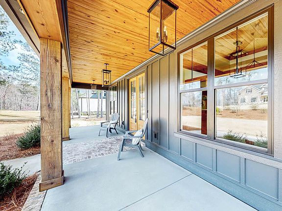 The upgraded tile in the owner's bath adds a touch of sophistication, while the impressive walk in closet and all solid wood closets—no wire shelving here—ensure your storage needs are met with style. The owner's closet flows seamlessly into the spacious laundry room with utility sink, ample storage, hanging rod all with main hall access. Designed for both convenience and privacy, three well-appointed bedrooms on the main floor each enjoy their own bath, while a versatile fourth bedroom or bonus room upstairs features a private bathroom, perfect for guests or family. With separate HVAC systems for upstairs and downstairs, comfort is guaranteed year-round. Situated on a generous .55-acre lot with no one to build to the right of the property, this home overlooks a lush golf course green, offering serene views from the large patio and screened porch, equipped with cable hook-up and strategically placed outlets for effortless party light installation. The large rocking chair front porch and oversized two-car garage features a metal roof bump-out that adds a unique architectural element. Every detail has been thoughtfully considered, from the upgraded black grid windows to the wood accents that create a warm and inviting atmosphere throughout. The elegant wood porch ceilings further elevate the home's aesthetic. Experience the epitome of luxury living with modern conveniences, including a Rinnai tankless water heater and ample under-house storage with double doors. This spectacular custom new home is not just a residence; it's a lifestyle waiting to be embraced. Welcome home!