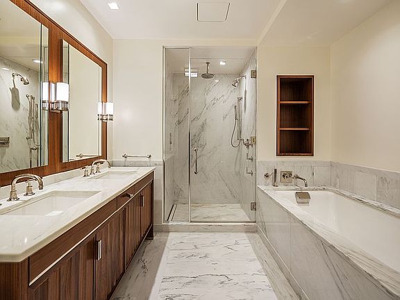 Additional features include a laundry room, central air, hardwood floors, motorized shades, custom drapery, and multiple built-out walk-in closets, all framing remarkable views of the Hudson River and New York City skyline.