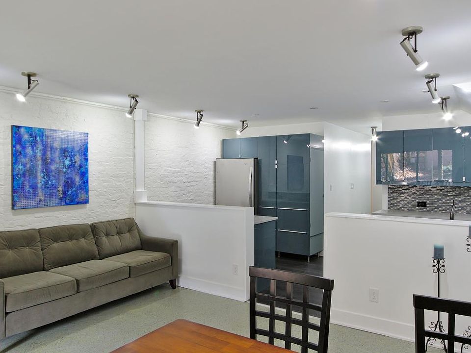 Freshly renovated Center Square apartment in historic bridal row house! A rare opportunity. Don't let the traditional row-house appearance from the outside fool you, the interior has been fully renovated with a modern appearance that gives exceptional lighting and plenty of storage space. The exposed brick in most rooms creates a welcoming and engaging atmosphere, while the open floor plan creates a great environment for entertaining. The state of the art kitchen was designed by someone that cooks, for someone that cooks. The upgraded appliances, cabinetry, and tile backsplash create a luxury feel. And forget hand washing dishes and prepping ice trays; you will have a dishwasher and automatic icemaker, letting you fully enjoy hosting friends and family. The bedroom's distance from the living space and a massive walk-in-closet affords a couple the flexibility of different sleep/wake schedules. The top quality carpet and pad ensure a warm and cozy feel as you start and end your day. And a private laundry room, with quality front loading units provided, saves you the time, hassle, and expense of the laundry mat. The back of the house opens to a lovely patio area, with bistro furniture provided, through an oversized sliding door. This allows natural light to flow into the living area, without compromising your privacy. The quaint views of the garden will let you escape "city life" when you just want to relax or enjoy a warm breeze in the summer. Truly enjoy all the amenities of home-ownership, in a space you can be proud to call home! Hot water included.