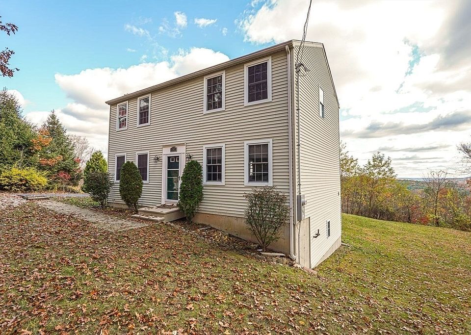 Welcome to this Colonial Home, a blend of Modern Elegance & Custom Design  Located near Outskirts of Town in a Rural Neighborhood. Open Concept Living space Ideal for Entertaining. Hardwood Flooring throughout the Main Level. Updated Eat-in Kitchen features Stainless Steel Appliances, Granite Countertops, a Spacious Island, Custom Built Wall of Storage w/ access to a Deck overlooking the Wooded Backyard and Spectacular Views! First Floor Laundry Rm is shared with a Half Bath.  Upstairs find 3 good sized Bedrooms. The Primary Bedrm Suite hosts 3 closets, one being a Large Walk-in Closet.  Recently Updated adjacent Tiled Double Vanity Full Bath includes a Walk in Shower with another Large Walk in Closet. New Carpet recently Installed. Unfinished Lower Level offers a Ton of Space that can be finished. The current owners used a few areas as a Family Room and a Home Gym/Office.  Built in Storage will stay.  Wood Pellet Stove is not currently hooked up. Close to Rt 84/CT and Rt. 90/MA Pike.
