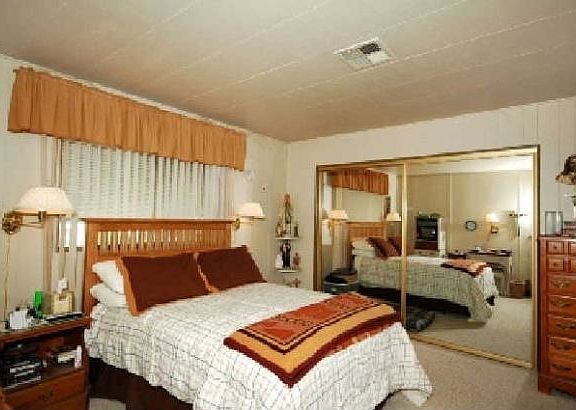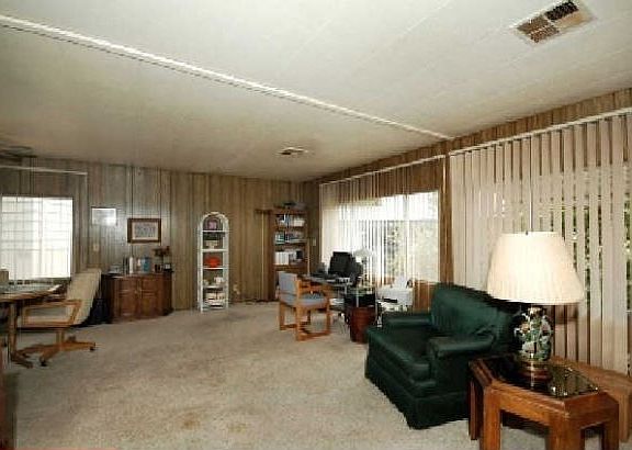 Spacious mfd home in quiet sr. park. 2 bd, 2 ba w/open kitchen; new dishwasher & oven. Front deck, shaded by vintage oak w/low-maintenance yard. Two-car carport awning. Custom window coverings stay with home. Country living, close to amenities.