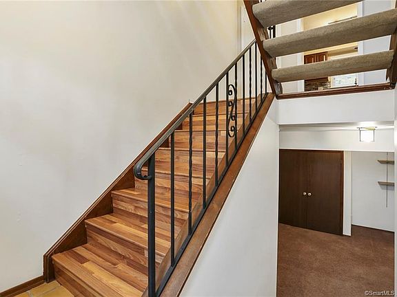 Columbus Manor complex is well maintained by longstanding homeowners. This spacious end unit in small complex has had many updates. Eat in kitchen has been updated with stainless steel appliances, newer cabinets, granite countertops and recessed lights. Flooring on main level has dark laminate in excellent condition. Living room has extra large bay window with sliders leading to balcony off dining room. Beautiful blinds throughout will remain in place. Upstairs level has two spacious bedrooms, just painted and carpets cleaned. Main bedroom bath has new vanity, toilet, medicine cabinet and light fixtures. $1,000 CREDIT to replace carpet in second bedroom. Hall bathroom has been totally renovated. Lower level has plenty of room to use as office, family room or den. Also laundry closet, half bath and interior access to garage. New fire safety door in place. All windows have been replaced. Well maintained complex also has redone all balconies, siding and roof. No assessments outstanding and low common charges. Walkable to Springdale train station and less than 5 minutes to Merritt Parkway. Shopping and restaurants within walking distance as well. Make an appointment to take a look. Agent related to owner.