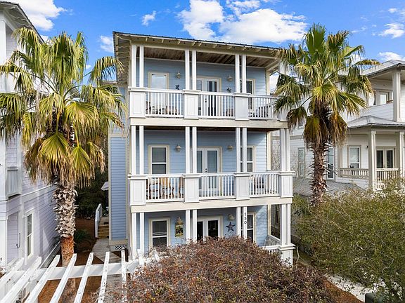 Backing up to Camp Creek Golf Course with a freshly painted exterior and just steps from private beach access and the community pool, this beach cottage is the perfect coastal getaway or rental investment property. Steps lead to both a front entry and side entry with porches on all levels along with a private back patio delivering enviable outdoor living space for relaxing and dining in the sun. The main entry opens to a spacious living area filled with natural light, new flooring and updated furniture. The living area seamlessly flows into the dining space and newly renovated kitchen boasting a center island, ample storage and stainless steel appliances. A renovated full bathroom, laundry room and large storage closet add additional conveniences to the first level. The second level features two oversized guest bedroom, each with ensuite bathrooms, along with hallway bunkbeds for flexible sleeping space. The third level offers two additional bedrooms, a guest room with an ensuite bathroom and the primary bedroom. The spacious primary suite features a sitting area, ensuite with dual vanities and a balcony with views of the gulf and neighboring rooftops. Cottages at Camp Creek is a charming neighborhood offering easy access to Scenic Highway 30A in close proximity to Alys Beach and Rosemary Beach with renowned restaurants, local shopping, seasonal events and weekly farmers markets. This community is centered around the large pool and hot tub surrounded with lush landscaping with your private beach access, and ability to set up your beach day right off the access, just a short walk down 30A.