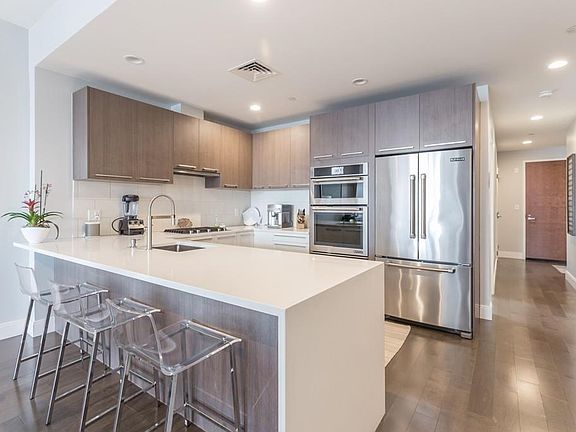 Contemporary PH featuring 2 bedrooms plus an office/den & 2 full bathrooms. The fashionable space is highlighted by high ceilings and floor-to-ceiling windows. The sun drenched open concept boasts an ultra modern kitchen with stainless steel appliances, quartz countertops and oversized peninsula, hardwood floors, recessed lighting & ample living and dining areas. The luxurious master suite, is king sized bed ready, with walk-in California closet, & spa style bath w/double floating vanity & walk in shower. The guest bedroom is gracious in size and has a skylight and ample storage. The extra bonus space off the kitchen can be utilized for an office, den or media room. The home also features an additional California walk-in closet for added storage and laundry. Central AC, remote controlled Hunter Douglas blinds, double private roof deck space with city and Harbor views, garage parking & elevator complete this home. Conveniently located to Broadway T stop & surrounding neighborhoods.