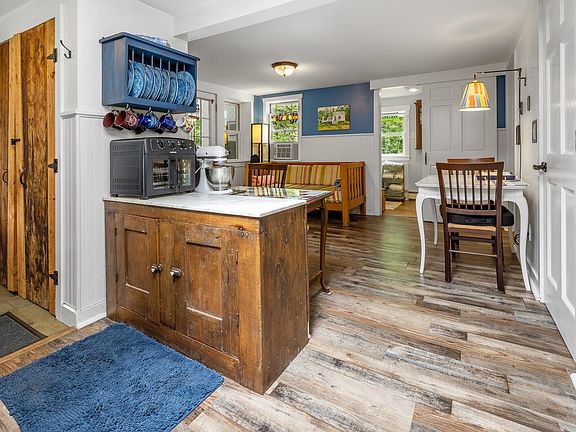 Introducing a captivating two bedroom home nestled on a 1.5 acre lot, with numerous updates and delightful features, this home offers a remarkable living experience. Discover the allure of three inviting porches: two covered porches, protecting you from the elements while enhancing your outdoor enjoyment, and a captivating three-season porch that overlooks a tranquil brook. With large glass windows, screens, and insulating storm inserts, this porch is an idyllic retreat for savoring morning coffees and sharing unforgettable moments with friends. Inside, an inviting foyer welcomes you, adorned with an abundance of natural light that gracefully illuminates the space. The open concept living room, recessed lighting, and new floors, creates an inviting ambiance for relaxation and socializing. The fully updated kitchen awaits, showcasing modern appliances, sleek soap stone countertops. Adjacent to the kitchen, a dining area sets the stage for memorable gatherings with loved ones. The main floor bedroom offers serenity and privacy. The second floor bedroom can effortlessly adapt to suit your needs as a guest room, home office, or cozy retreat. A full bathroom on the upper level, featuring a tub/shower, commode, and sink, ensures convenience and comfort for all residents and visitors. A delightful tiny house, nestled within the property, serves as charming guest accommodation for those with a glamping mindset.