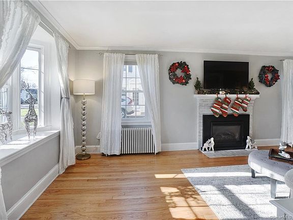 This sun filled charming vintage brick and stone cape features 2 large bedrooms, 1.5 baths, granite kitchen with stainless appliances and a breakfast bar opening up to the formal dining room with wainscoting & updated lighting. Formal living room with a gas fireplace and a beautiful bay window. Classic open oak staircase leading up to the bedroom level. The family room was an addition featuring wood beams on the ceiling and an Anderson atrium door leading to the back yard and a stone patio. The full bathroom has original black & white tile in excellent condition. Hardwood floors throughout, vinyl replacement windows, crown molding, attic eave storage, garage, good sized yard partially fenced. Located in a quiet yet convenient neighborhood. This one won't last!