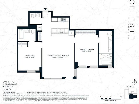 Welcome to 11C at Celeste. This high-floor split 2 bedroom 2.5 bath features all South-facing windows that provide magnificent sunlight from morning to evening. A spacious foyer includes a closeted Bosch washer and dryer as well as generous coat closet. Conveniently located off of the main living area, the powder room is a masterpiece of international design, complete with custom cabinetry and mosaic marble tile backsplash. Six-inch wide walnut floors are a perfect compliment to the neutral warm palette of finishes. Showcasing unrivaled craftsmanship, the brilliant open concept kitchen was custom designed by Urban Homes featuring high-gloss white lacquer cabinetry by Aster Cucine, Gaggenau appliances including a wine cooler, as well as a full-height pantry. The unique kitchen countertops and backsplash are Danby Marble locally sourced from Vermont . The expansive King-size master suite features much-sought-after Southern views and an abundance of closet space. A tranquil retreat is within reach as the windowed en-suite master bath features radiant heated Grigio St. Nicolas grey chevron floors, double vanity, and Zucchetti fixtures. The wet room has an oversized shower as well as a deep soaking tub with Bianco Dolomiti marble walls. Exquisitely appointed in the heart of Gramercy, Celeste offers a world of privacy and serenity steps from Madison Square Park. Designed by award-winning architect, Eran Chen of ODA, Celeste soars 20 stories, and showcases a magnificent collaboration of limestone and glass, as the upper floors taper in like the points of the North Star. Residents have access to an extensive selection of world-class private indoor and outdoor amenities including: outdoor pool, landscaped sundeck, rooftop terrace, children's playroom, lounge area and state-of-the-art fitness center. Tenants pay for one month broker fee to listing agent. Owner will pay all other application fees. Tenants pay $1000 moving deposit (refundable), $500 moving fee (non refundable) Utilities, tenants pay for electricity only which is around $100-$200 according to last year, gas/water/floor heating all included. Smoking allowed:No