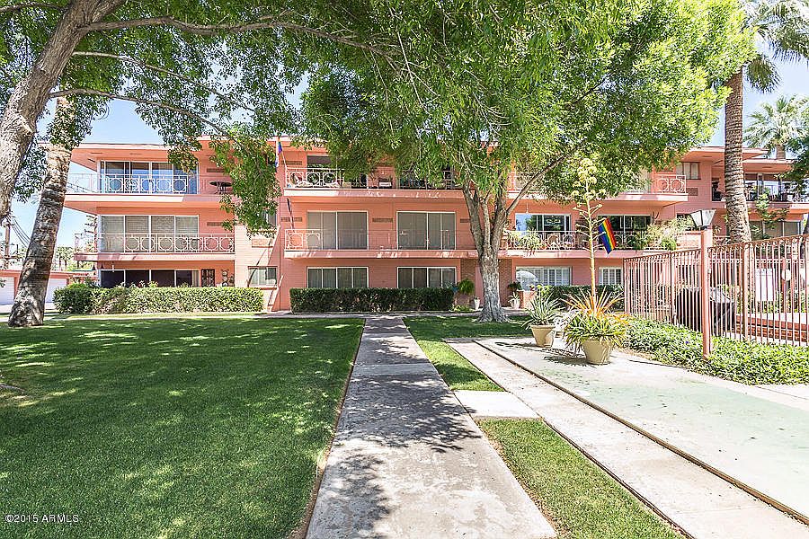 Marvelous mid-century modern architecture in location accessible to Phx Art Museum,Phx Theatre,Heard Museum,lite rail,I-10. Largest flr pln on ground floor remodeled in 2012. Bamboo flrs, large windows overlook lush lawns,1 of 2 pools, 1 garage. HOA covers all util. & prop. tax & ext. maintenance. No financing available must be cash purchase.