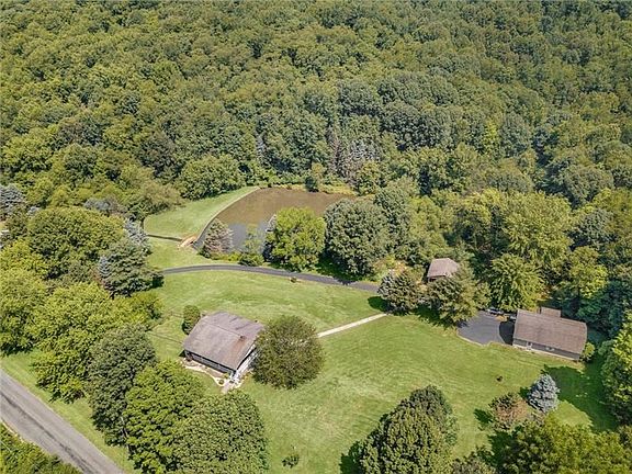 Presenting the opportunity to enjoy your own private retreat! Situated on 56 acres with a lake, pavilion, expansive green space and surrounded by trees! You will be greeted by a wraparound porch to admire the scenery from all angles. The main level offers open concept kitchen and living room, two bedrooms and full bath. The walkout lower level features an expansive game room, additional bedroom option, full bath and den. The extended driveway leads to a two-story, four car detached garage. What more could you want PARADISE AWAITS!