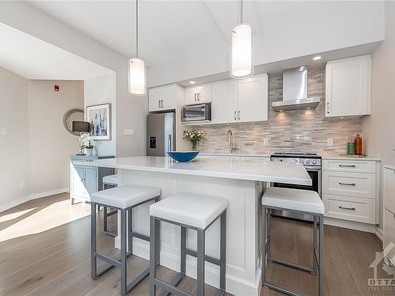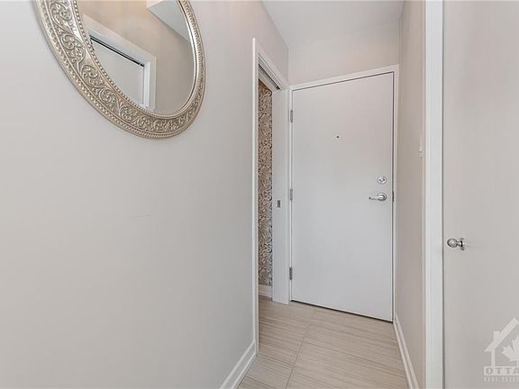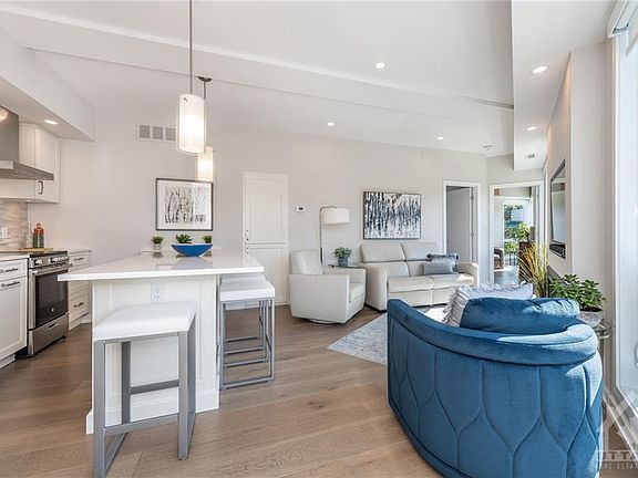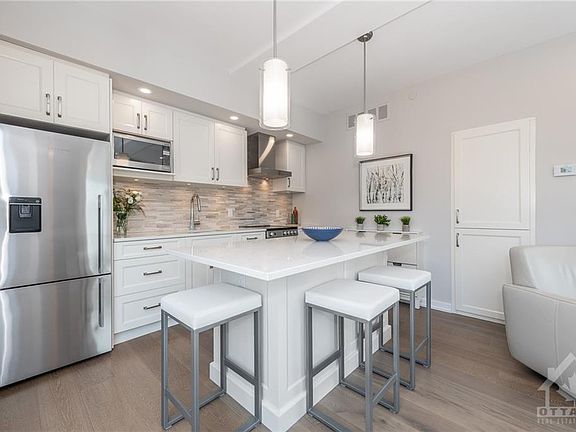 Location, location, location! Welcomed by floor to ceiling windows, 9 ft ceilings & beautiful laminate flooring & tile throughout, this home has been upgraded & customized for absolute efficiency & style. The open concept living features a bright kitchen complete with high end stainless steel appliances, muskoka cabinetry, hidden pantry & over sized quartz island, perfect for the ultimate host. The sleek design of the electric fireplace & built in television space ties the living area together. The primary bedroom is the ultimate oasis. Designed to fit a king size bed, this beautiful room offers a built in closet, 2 additional wardrobes & en-suite complete with a wide-bowl sink, walk in shower & full size washer & dryer. The 2nd bedroom is ideal for a home office or a quick overnight guest. Enjoy the views from every corner of this condo, especially on the rooftop terrace! Walking distance to the Rideau canal & local shops! 1 underground parking* & 2 bike storage spaces* [*owned].