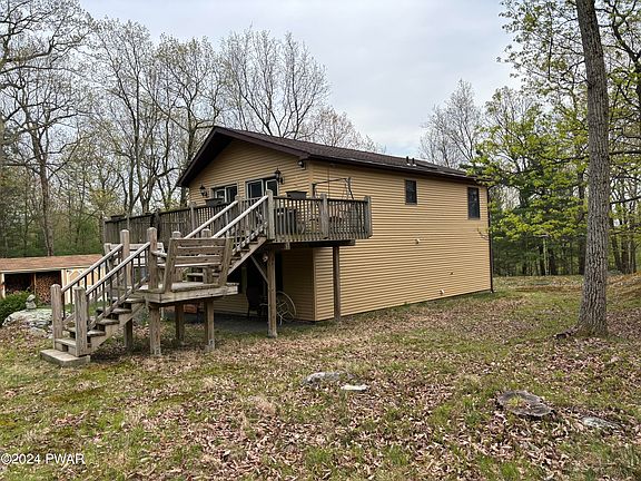 Tanglwood North community home on 1.38 acres backing up to State Game Lands. Walk out your door to hiking and hunting in your back yard. Property also includes deeded lake rights to Lake Wallenpaupack through Tanglwood Lakes Community access area. Walk into the first floor with main bedroom, bathroom, laundry, family room and one car garage all on one level. The second level features an open living, dining and kitchen area with wood burning fireplace. Off the living room features a large deck with steps leading to your own nature preserve.