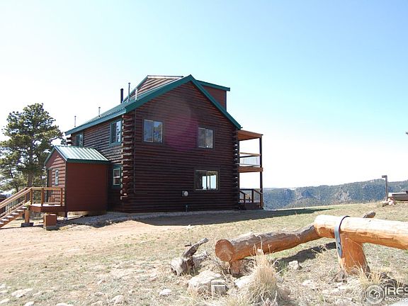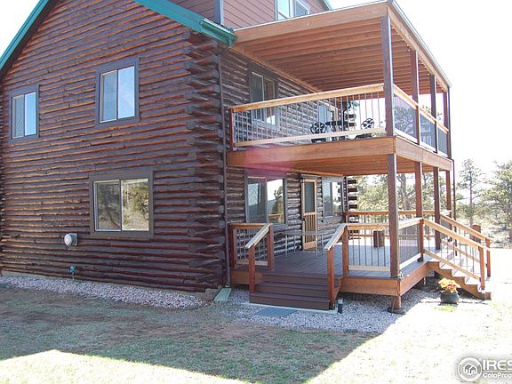 PANORAMIC VIEWS overlooking Prairie Divide and the snow capped Mummy Range. 3 story furnished Log Cabin in Poudre River Ranch on 39.16 acres bordering National Forest! Includes 3 bedrooms, 1 bath plus rec room/bunk-room. Electric is solar, battery storage & generator, well, 1,200 gl cistern, septic, propane appliances, wall mounted heater, wood-burning stove, 500 gl propane tank, outdoor privy, 16 x 24 shop. Park like setting on gentle slopping land giving easy access to the majority of land.