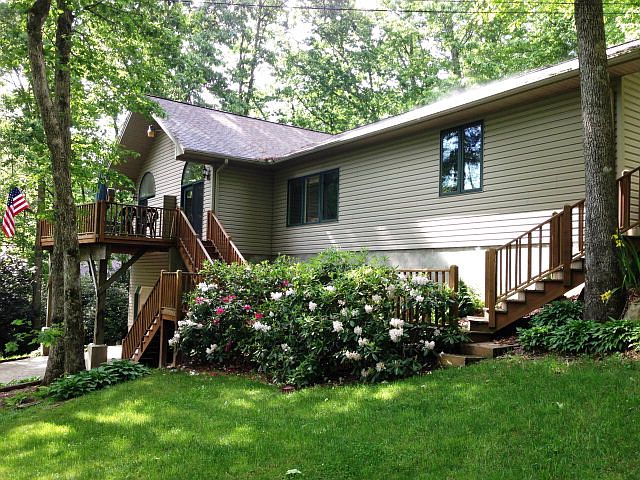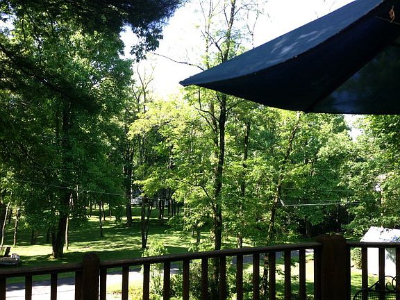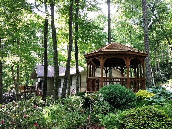 The Birdhouse sits up in the trees but has two driveway entrances for wheelchair accessiblity.It has two garages upper(517sf) and lower(552sf)It also has a huge downstairs woodshop area of approx 800 sq ft.with 12'ceilings, that could be transformed into additional living space if needed.Open and split floorplan with T&G pine cathedral ceilings,eat-in large kitchen with bay window looking out on the flower gardens,lots of oversized windows, french doors, high ceilings,and beautiful yards!House is very light-filled,and you feel like you are up in the trees...such a beautiful setting!!