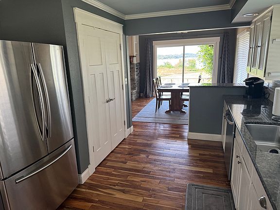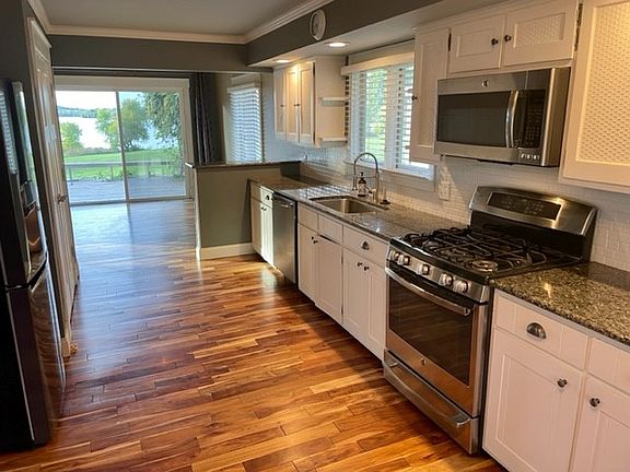 Rustic and cozy furnished Colorado style ranch. 2 bedroom, 1 1/2 bath ranch with 1,020 SF on main floor and approx. 765 SF down. Main floor features tiled entry, large kitchen with white cabinets, stainless steel sink and faucet, granite countertops, upgraded stainless steel appliances including gas stove, breakfast bar and large walk-in pantry. 10' ceilings in dining area and family room. Rustic ceiling beams with up lighting. Hardwood flooring & center stone fireplace. Oversized slider to large deck overlooking backyard and lake. One bedroom on main floor with 2 spacious closets, 3/4bath & linen closet. Lower level is finished, has 2nd bedroom area, family room, office/work area, bath, laundry & storage. Home backs to Rock Creek State Park, walk out your back door to hiking paths and instant kayaking and fishing.