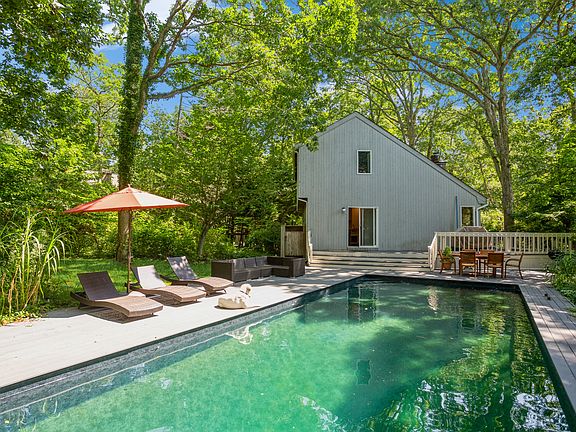 Rental Registration #: 23-654 Clearwater Beach Area, sunsets abound...Available Aug 6th -LD Located in the Clearwater Beach Community (Gardiner's Bay). PRIVATE BAY BEACH: Clearwater Beach reservation features 200 feet of beach overlooking Gardiner's Bay, Springs, New York. PRIVATE BOAT MARINA: Clearwater Beach Marina offers 120 boat slips and related services to residents. This Salt Box home has plenty of warm sunlight! There are three bedrooms and two baths (both newly renovated), with junior primary bedroom located on the first floor. The open floor concept has a living area with fireplace and dining area. The kitchen is separate and newly renovated. Off the kitchen is a large entertaining deck that overlooks the salt water pool, mature trees and plantings.