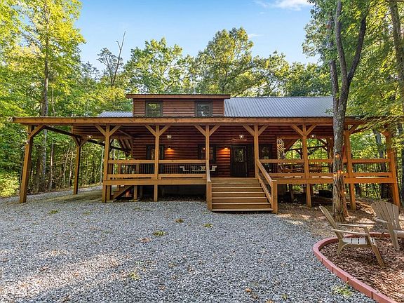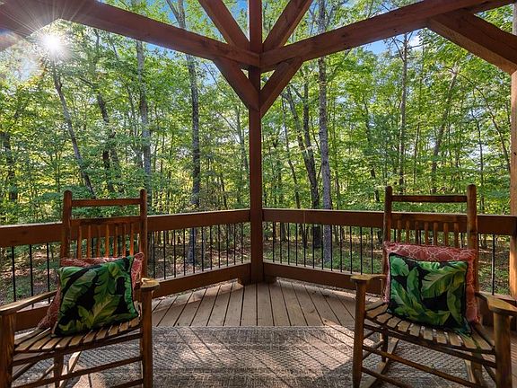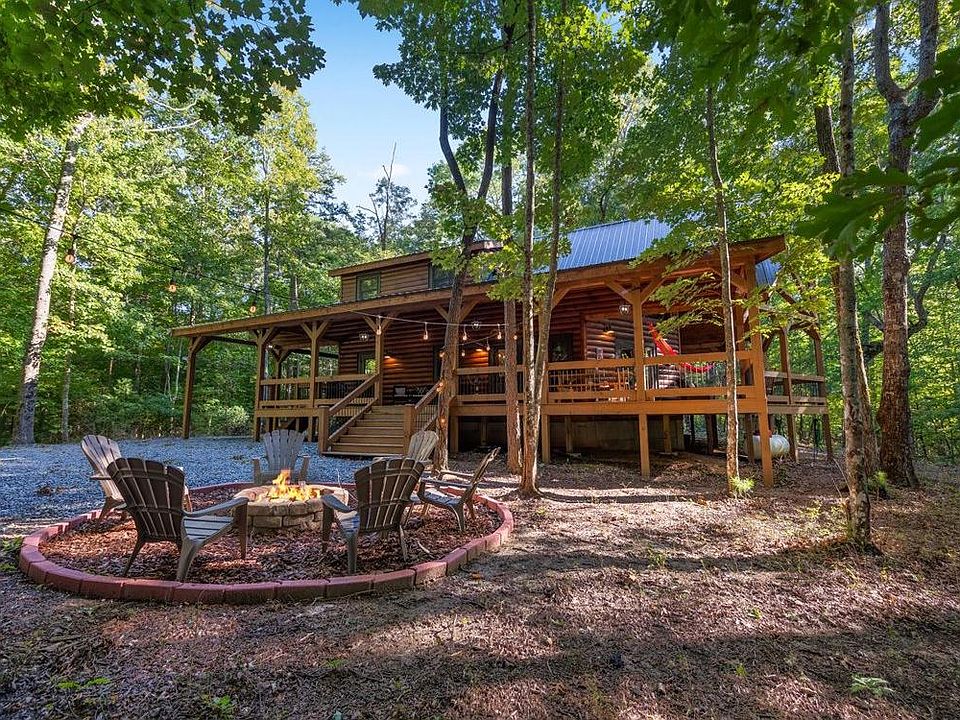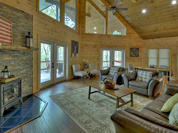 Charming Storybook Cabin boasts refined rustic flair Inside & Out with warm industrial finishesnot your cookie cutter this spacious 2- 3BR/2 baths jewel boasts comfort and custom upgrades..soaring ceilings & tons of glass allow for a light, open interior, unique & cozy gas stove fireplace adorns large living area, stainless kitchen appliances & custom cabinetry, spacious bathrooms, warm industrial touches throughout, inviting interior with wood floors & unique touches, lovely & large loft makes perfect bedroom area or great for flex roomexercise, home office, sewing, and more outdoor wrap around "gathering porch" & sprawling decks with hot tub and covered parkingsurrounded by long range views of the mountains, fabulous fire pit and picnic area..ultimate curb appeal, perfect for that much needed getaway cabin with great established rental history, minutes from The Toccoa River & Lake BR in quaint & quiet area...a must see and tastefully furnished for a turn key purchase!