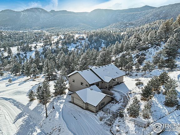 Great private location in fabulous Pinewood Springs community, featuring walking areas and lake venues. Mountain views from every window. Spacious deck with hot tub & large grill. Huge Master bedroom with cathedral ceilings, gas fireplace, special bathroom with heated flooring and large walk-in closet. Indoor sauna. Impressive theatre room with all equipment provided for TV, movies, surround sound, floor lights, nine reclining, cushioned chairs on 3 levels up. Tall, cathedral ceilings, open floor plan, wood columns throughout, loads of large closet space, separate office with long worktable. Large, open basement room for games, bar, workouts, with kitchenette, sink, 2nd fridge, microwave. Large storage room, doggie door with outdoor fenced kennel area. Flowing creek in outdoor home-front (with remote). Unique design features throughout home. Uniquepantry design, loads of kitchen closet drawer space. Separate laundry room with sink and table. Only 15 minute drives to Estes Park and Lyons. Must see this home to believe it. Seller is downsizing and moving to be closer to family.