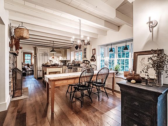 Step inside to find a seamless fusion of historical richness and modern comfort. The main house boasts two impressive stone fireplaces, honed Irish limestone countertops, and exquisite plaster walls that evoke a sense of timeless elegance. French oak flooring, salvaged from a castle in France, adds a touch of European sophistication to the interiors. The home's 43 Marvin windows frame panoramic views of the bay, inviting natural light and a serene ambiance.