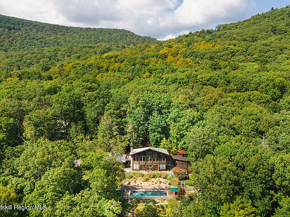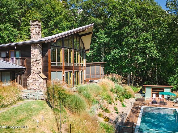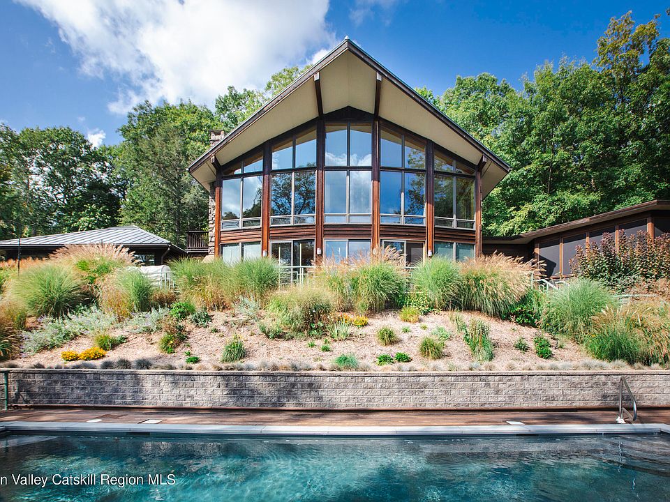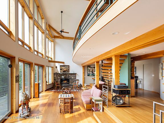 Perched high on Overlook Mountain just a mile from the heart of Woodstock, this striking contemporary residence—designed and built in 1995 by the iconic Bananas of Woodstock—is a rare architectural gem that seamlessly blends creativity, quality, and comfort.