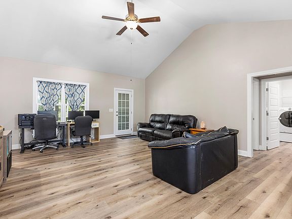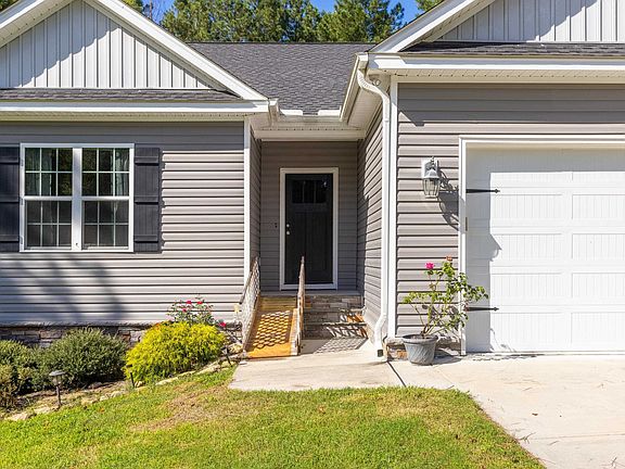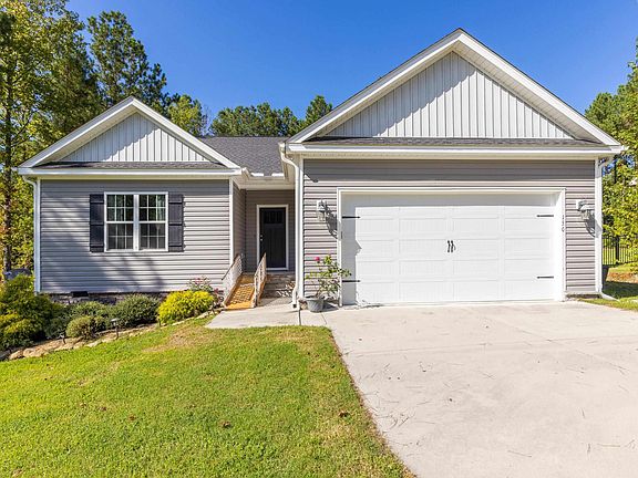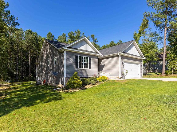 Split ranch plan offers one easy one-level living. Cathedral ceilings in living room open to kitchen with eat-in nook, custom cabinets, stainless steel appliances and granite countertops. Owner's suite offers a walk-in closet, dual vanity and large walk-in shower. 2 bedrooms on opposite side of house share a bath with tub/shower and large vanity. All LVP floors throughout house, no carpet! Large laundry room beside owner's suite and off the 2 car garage. Large and flay .94 acre lot surrounded by mature trees. Seller had Leaf Filter gutter guards installed and warranty transfers. Large covered deck could be screened in easily. Easy commute to Raleigh and close to shopping. Come check it out today!