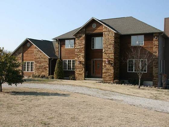Absolutely Pristine Location! Elegant Custom Home on 10 acres w/ Mountain Views & Horses are welcome! French doors to Library-Study, impressive staircase. Comfy living room w/fireplace. Gourmet Kitchen w/lots of character! Luxury Master suite. Unfinished Lower Level area. Gated Community w/Estate Homes & Ranches. 15 mins to Branson Landing, Convenient to New Branson Airport. Choice of Schools. Room for Big Boy Toys inside 3 bay Custom 60x60 Red Iron Outbuilding w/ infloor radiate Heat & luxury Apartment/living quarters. plus 50amp RV hookup.