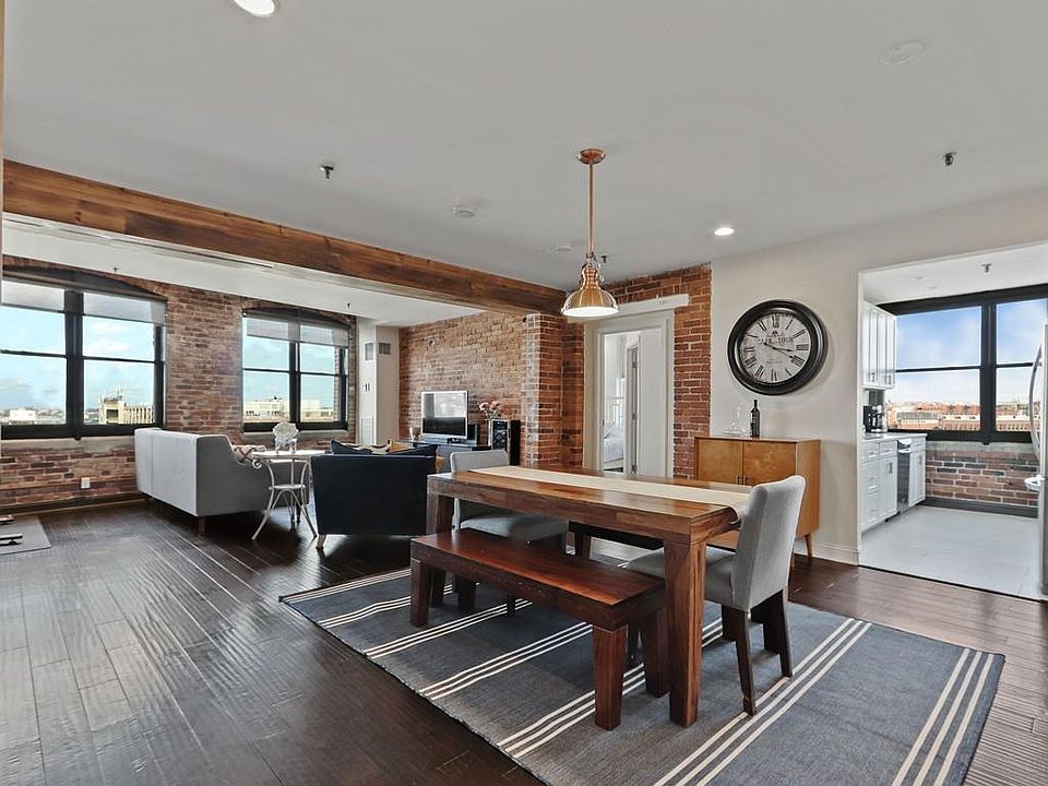 Sunny two bed two bath condo in Jeffries Point! This corner unit is situated on 6th floor of the Gumball Factory offering great views. Natural light pours through the oversized windows and exposed brick & beams add warmth and texture to the space. The kitchen features stainless steel appliances, quartz countertops, glass subway tile backsplash, and ample space for meal preparation. The master bedroom has his & hers closets and an en suite bathroom with stackable washer & dryer. The second bedroom is bright and airy with windows on two sides and is finished off with a walk-in closet. Updates in this home include: new bathtubs (2019), new hardwood floors and walk-in closet in 2nd bedroom (2019), new flooring, light fixtures, and medicine cabinets in both baths (2020). This unit includes 1 deeded parking spot and basement storage. The Gumball Factory is located on the greenway which leads directly to the best view of the city! The Blue Line is .2 miles away and in 1 stop you are downtown.