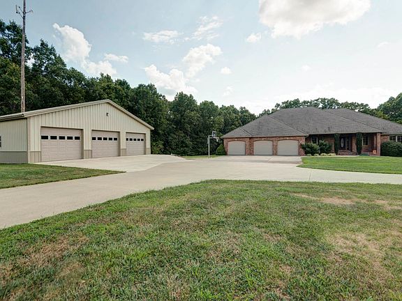You can have it all in this spacious all brick beauty with privacy, acreage, in ground pool, out door kitchen,shop building and woods in back. Situated on 13.25 acres, inside the living room and kitchen are open to each other. Handscraped hardwood flooring in the Kitchen and dining room. Three bedrooms on the main level with the split bedroom plan. The huge master with luxurious bath and large wall in closet is a nice retreat. The lower level is like new with new carpet and tile, rec room with well equipped wet bar and media area, 3 bedrooms, full bath, storm shelter and a John Deere room. Other amenities include zoned HVAC system, alarm system, two gas fireplaces, extended covered deck, and a detached shop with 3+ stalls. Over 6500 sq. ft.