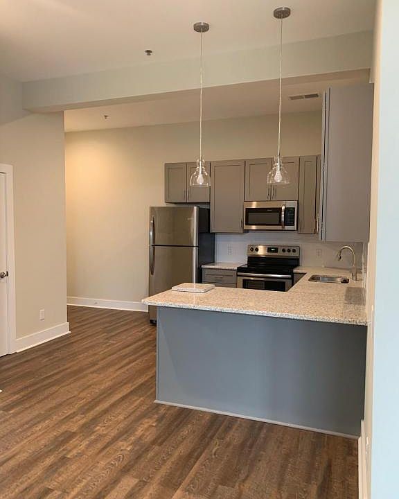 Unit P This is a 2bed/2bath corner unit with views of Ray Kennedy Drive and Market Street. The kitchen has stainless steel appliances, platinum gray cabinets, and quartz countertops. There are 10-foot ceilings throughout with french doors opening to a walk out balcony. It has a modern split floor plan with ceiling fans in bedrooms and living room. Rent includes valet trash, in-unit stack washer/dryer, interior mailbox, and sewer. Water is submetered and billed monthly. Duke Energy and Spectrum are the tenants responsibility. There is a $100 application fee and $150 administrative fee due on approval.