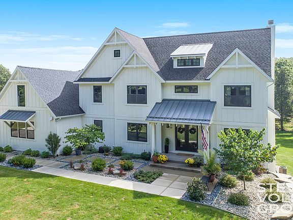 This chic and timeless, practically-new, 6 bedroom home on 2.5 acres in the hills of Ada. Thoughtfully designed floor plan featuring open-concept kitchen, living & dining area. Main floor also boasts formal dining, sun room with slider to stamped concrete patio, office with french doors, bedroom & half bath. 4 bedrooms and 3 full baths and laundry upstairs, including Master Suite with vaulted ceilings, walk-in closet and luxurious bathroom. Enjoy high-end details including Cambria Quartz and custom butcher block countertops, Ash engineered hardwood floors, plantation shutters and interior & exterior NUVO sound system. Room to grow with unfinished bonus room above garage, and walk-out basement plumbed for wet bar & full bath. On bike path & walkable to Roselle Park & Downtown Ada! See attached list of additional home features.