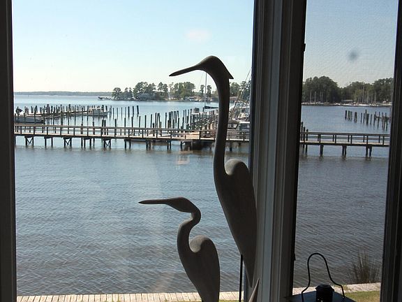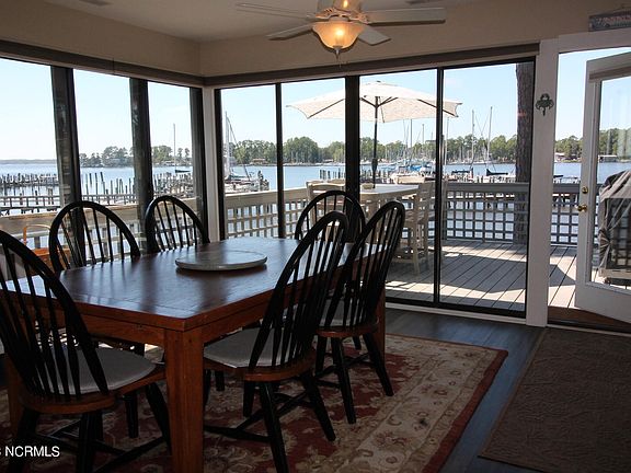 A LITTLE BIT OF PARADISE. You will not believe the sweeping views of Broad Creek, the Pamlico Plantation marina, and the Pamlico River. The large windows make you feel as if you are over the water, it will take your breath away. The open floor plan of this end unit townhouse lets you enjoy the one-of-a-kind view from all the living space on the first floor. This lovely home offers 3 BRs, two upstairs with a full bath. One bedroom on the main level with a full bath. There is a newly updated half bath for your guests and another full bath below in the heated and cooled storage/work room area. The updated kitchen has solid surface counters, with all new appliances and a 5-burner gas convection oven. You'll have everything you'll need to create wonderful meals for your family and friends. New flooring in most of the main level. Large capacity stacked washer and dryer are conveniently placed and stay with the home. WIFI controlled 2022 Daikin HVAC. The home offers 2 great decks to take in the views, one off the main level and another at ground level that feels very private. The assigned boat slip has electric and water. The boat slip can accommodate a lift but one is not there now. Owners launch their kayaks right from the back yard. 2 kayaks will stay to get you started! I haven't even mentioned the list of amenities the gated community of Pamlico Plantation offers! Marina, boat launch, fenced recreational vehicle lot, tennis, pickle ball, basketball, pool, club house, basic cable, water, sewer, trash, landscaping & most exterior maintenance of home. Make plans to see this unique combination of a laid-back river cottage with the all the outdoor activities one could imagine!
