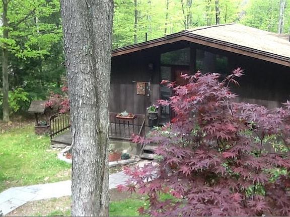 Lake front Acorn Deck House overlooking beautiful Longford Lake. Post & Beam with natural woods meld in perfect harmony with nature, inside and out. New roof, Brazilian tiger wood and custom slate floors, woodmode kitchen w/SS appliances, gas FP w/built-ins. Oversized 2 car heated garage and 20 x 15 storage shed. Gorgeous views from the elevated deck. Perfect for year-round or seasonal enjoyment.