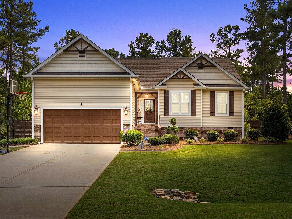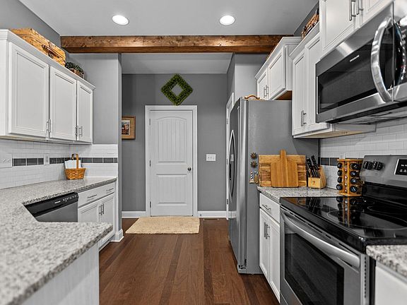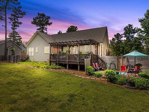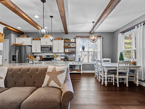 Charming Ranch Plan with Modern Upgrades! This ranch-style home features gorgeous vaulted ceilings with custom beams, creating an open and airy feel throughout. The updated kitchen is a chef's dream, boasting granite countertops, floating shelves, and an abundance of custom cabinetry for all your storage needs. The oversized primary bedroom offers a tranquil retreat with an adjoining sitting room, perfect for relaxation. Other notable features include, designer lighting fixtures and a custom fireplace. Situated on nearly half an acre, this property provides ample space and privacy. The fully fenced-in yard backs onto a serene wooded area, offering a peaceful and secluded atmosphere. Lush landscaping surrounds the home, with beautiful greenery in the front, sides, and rear. The backyard is an entertainer's paradise, centered around a spacious double-sized back porch and a grill deck, perfect for hosting gatherings. *Roads are expected to be paved and turned over to the state this summer. Things that do NOT convey include: RING Doorbell, Roll-up Blinds on Deck, Wood Bench and all Shelves in Garage & Refrigerator in Garage.