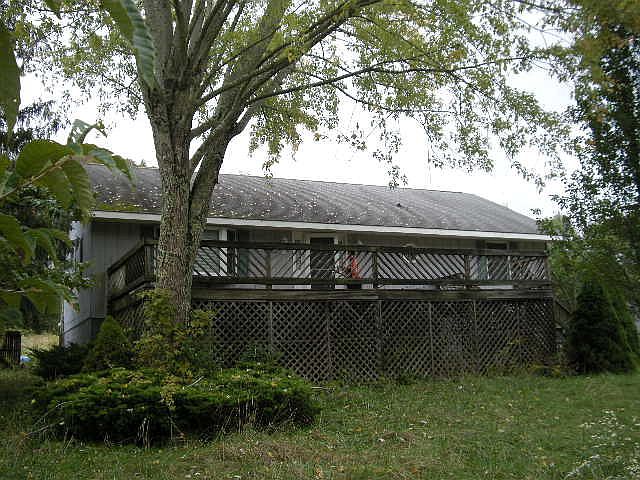 Nice house with vaulted and beamed ceiling in living/dining area. Big wooden deck on both front and back. 3 beds, 2 baths but all carpet has been removed. This would be a very nice home with the size of the lot and the privacy fence in the back if carpet replaced. Just a little paint would also help. Very private location, T-111 siding, 6 panel interior doors. Big decks to enjoy nature. 2 car detached garage.