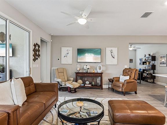 Under contract-accepting backup offers. Located in the highly sought-after Trilogy Orlando, Cascades of Groveland, this premier 55+ guard-gated community offers resort-style amenities within its 57,000 sq. ft. clubhouse, including a state-of-the-art fitness center, restaurant, and billiards. Outdoor features include a resort-style swimming pool and spa, tennis, pickleball, and bocce courts, as well as walking trails. With endless clubs, events, and social opportunities, residents enjoy an active, vibrant lifestyle in a beautiful setting. This beautifully maintained 3-bedroom, 2-bath home with a versatile flex room is perfectly designed for today’s lifestyle. The open-concept kitchen showcases asn oversized, spacious island, modern finishes, and ample counter space, making it ideal for cooking, entertaining, and gathering with loved ones. Elegant faux wood ceramic tile flooring flows throughout the main living areas, while plush carpet in the bedrooms creates a warm, inviting feel. The oversized laundry room features cabinets, countertops, and a built-in desk area, while the garage provides extra storage to help keep everything organized. A screened and extended lanai overlooks the fenced backyard with a serene partial water view, offering the perfect spot to enjoy your morning coffee or evening relaxation. Don’t miss the opportunity to make this beautiful home yours—schedule your private showing today and experience the best of Trilogy Orlando living!