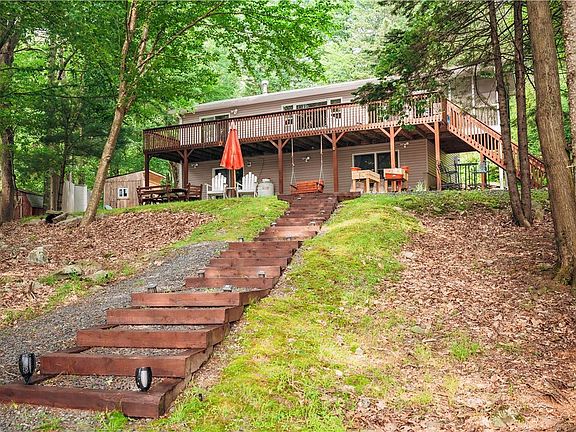 This exquisite waterfront residence on the picturesque Spruce Lake has been meticulously maintained, tastefully updated, and is eagerly awaiting new owners. Boasting an expansive .8-acre lot, this home offers a spacious open floor plan with soaring cathedral ceilings and exposed beams in the living room. The master suite exudes luxury with its separate jacuzzi tub and walk-in closet, while sliding glass doors lead to a deck that overlooks the serene lake. Pergo floors gracefully adorn the first floor, complementing the updated kitchen with its elegant granite island and stylish tile back splash. The lower level comprises two bedrooms and a well-appointed bathroom. The vast screened porch and newer deck, spanning the length of the house, provide the perfect setting for unparalleled entertainment opportunities. Completing this remarkable property is a one-car garage with an automatic opener, along with a brand new storage shed. With a private dock granting access to both boating and fishing, this home truly offers the best of waterfront living right in your own backyard!