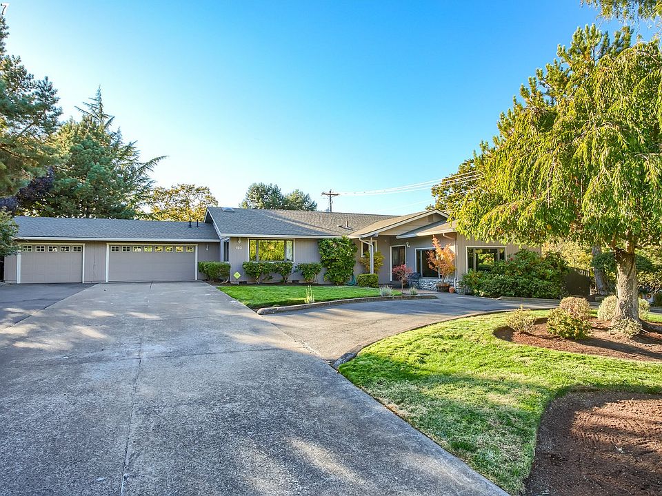 Enjoy spectacular views of of Roxyann Vineyard from this .41 acre private park like setting. This charming 3 bed 2 bath has vaulted wood beam ceilings and large windows with new low E Glass. The floor to ceiling windows offer gorgeous views from the kitchen and family room as well as the back yard. The large kitchen has updated cabinets, granite counters and an island with bar sink and counter seating.