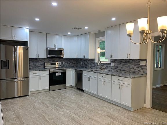 **RECENTLY REMODELED 3 BEDROOM 1.5 BATH RAISED RANCH ON CUL-DE-SAC**Nothing to do but move right in to this beautiful home. Brand new hardwood floors,Central A/C, new thermopane windows, new garage doors and openers, new roof on shed and newer roof on house, new exterior and interior doors/sliders & trim and energy efficient lighting and appliances. Gleaming hardwood floors adorn the main level which consists of a modern and spacious eat in kitchen with stainless appliances, granite counters, modern cabinets & gorgeous tile, Spacious living room with wood burning fireplace, den off of the kitchen with large windows and sliders to the deck, master bedroom with double closets and private entrance to the full bath as well as 2 generously sized additional bedrooms w/huge closets. The lower level of the home has a family room, seperate laundry room, half bath & direct access to the oversized 2 car garage w/ separate storage room and space for a workshop. The back yard has plenty of room for entertaining and family time with brand new fire pit area, white stone patio and a large shed. 3 zones of heating provide energy saving benefits. Fantastic location close to schools, Berlin Tpke for shopping and dining, conveniently located to Rt 15, I-691 and I91 access.
