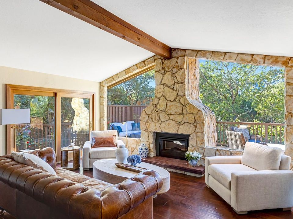 Beautifully updated Carmel Valley retreat nestled near Carmel Valley Village with views of Garland Park. This inviting 3-bedroom, 3-bath home blends natural beauty with thoughtful upgrades. A private gate opens to a spacious front deck surrounded by mature trees and a tranquil seasonal creek. Inside, enjoy a beautifully updated kitchen with granite countertops, farmhouse sink, custom cabinetry, and premium stainless-steel appliances. New hardwood floors, designer lighting, and fresh paint create a bright, cohesive feel throughout. The vaulted living room centers around a classic Carmel Stone fireplace, with two ensuite bedroomsone on each leveland open gathering spaces ideal for entertaining. Outside, a fully fenced yard features a grassy play areas, fruit trees, and a raised garden bed. A serene, move-in-ready retreat just minutes from Carmel Valley Village.