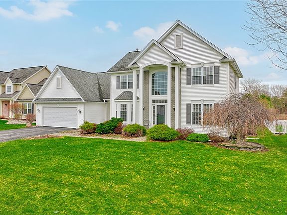 WHOA, HOLD UP! Town of Greece w/HILTON Schools! Step into this FANTASTIC colonial featuring a DRAMATIC 2 story foyer w/TURNED staircase & UPGRADED decorative railing w/metal balisters! The LARGE eat-in kitchen features LIGHT & BRIGHT white cabinets w/GRANITE tops and NEUTRAL tiled floors! There's a SPACIOUS dinette w/an 8 foot sliding glass door w/views FOR DAYS! This area flows right into the LARGE family room complete w/gas firelace and an additional living room too! The formal dining is ADORNED w/custom trim & picture frame molding! There's 1st floor living potential here w/a 1st floor den/bedroom (think work from home space) and a convenient side entry! Up you will find FOUR additional bedrooms and the DELUXE primary bedroom w/TRAY ceiling & SPA like bath w/DOUBLE sinks, corner Jacuzzi and separate shower! There's even a nice, TALL basement for future potential! Outside will not disappoint w/a POURED stamped patio overlooking the EXCEPTIONAL yard space & backing to a natural backdrop & pond! There's PLENTY of room to fence the yard for additional privacy! This location is KEY being on a cul-de-sac street with LOW traffic! Just a GREAT home to consider! Delayed negotiation FRI 4/25/25 @12PM