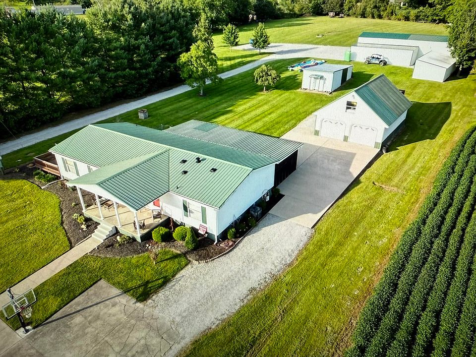 Looking for space to spread out? This 3 bed, 2 bath home sits on 3.5 flat acres and includes a 32x24 oversized 2-car garage with storage room, overhead living space, and 100-amp service. Also included: a 30x16 shed with concrete floor and electric, a 36x16 garden shed with electric, and a massive barn with 100-amp service—featuring a 64x16 center bay (perfect for campers), a 64x12 lean-to for equipment, and a 40x12 heated garage/shop. Inside the home, you'll love the 16x24 custom den with exposed beam, rustic metal ceiling, recessed lighting, mason jar fixtures, and a wood stove area. There's also a fenced-in dog area, second sitting room, foyer, hardwood floors, spacious dining, and a well-equipped kitchen with oak cabinets, island, and pantry. Two guest bedrooms share a full bath with crown molding, and the primary suite offers a large walk-in closet and private bath with a second closet. Plenty of room to live, work, and play!