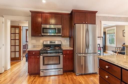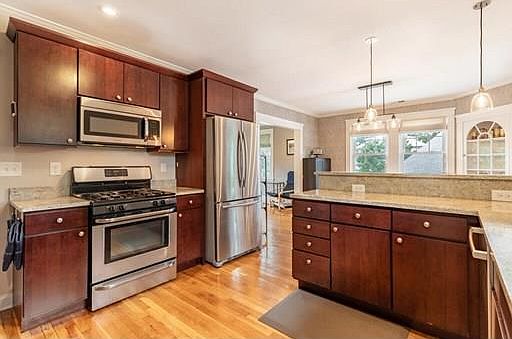 - Kit Dscrp: Flooring - Hardwood, Countertops - Stone/Granite/Solid, Breakfast Bar / Nook, Recessed Lighting, Dining Area, Stainless Steel Appliances, Open Floor Plan, Main Level, Balcony / Deck, Exterior Access, Washer Hookup, Dryer Hookup - Electric, Gas Stove, Crown Molding, Lighting - Pendant, Lighting - Overhead