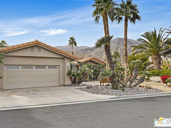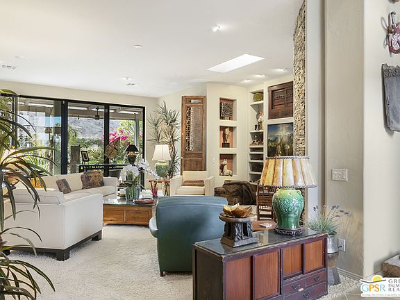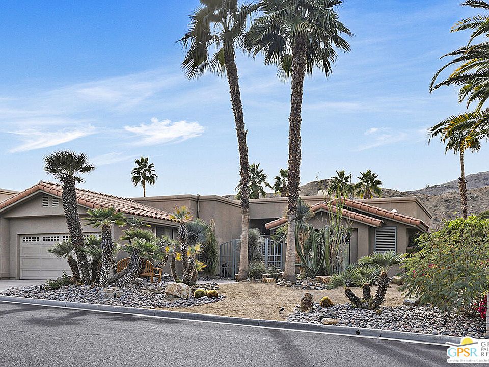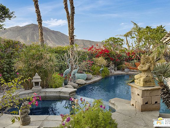 Turnkey furnished and decorated home that is move-in ready! Situated in the sought-after gated community of Vista Paseo on a prime perimeter lot offering both privacy and views. Make your way through the beautifully landscaped front garden into a gated entrance courtyard. French doors with full-height glass welcome you into a living area whose rear wall is entirely glass drawing you to the garden, centerpiece pool & spa and Cahuilla Hills view. Tastefully furnished with comfortable contemporary furniture blended with Asian-inspired pieces including several antique chests thoughtfully incorporated into the decor. High ceilings and walls of glass give this home an airy and open feeling. The room features custom-built floor-to-ceiling book and display shelves, a built-in flat screen TV with surround sound and a centerpiece stacked-stone fireplace. The warm and inviting dining area looks out through 8 foot high French doors with full-height glass onto a charming fountain surrounded by mature bamboo. Adjacent to the dining area, the counter in the niche with storage below is plumbed for a bar sink. All of the artwork and decorative accessories are included with the exception of the large (60" x 84") painting opposite the dining table. The spacious cook's kitchen with wonderful views to the garden and pool offers a work island, walk-in pantry, G.E. Profile stainless steel appliances, a Sub Zero refrigerator/freezer, and a wine refrigerator under the casual eating counter. The primary bedroom suite is truly a retreat with jetted spa soaking tub, bidet seat in the separate toilet room, large walk-in closet and slider access to the pool. Bedroom 2 is an attached casita with 10 foot ceilings and en suite bath. It has 8 foot high French doors with full-height glass and a single full-height glass door leading to a private outdoor sitting area. Bedroom 3 has 10 foot ceilings with 8 foot high French doors with full-height glass for private outdoor access to the garden and pool. It shares a "jack and jill" bath that can be locked off for privacy. There is an office space with built-in desk and storage. The separate laundry room has a washer and dryer less than a year old with ample counter and storage space and a chest freezer. It's styled after a butler's pantry that could be used by a caterer. Alternatively, it could be a handyman's workshop or a crafts room. A tranquil garden is the setting for a sparkling lagoon-like pool with spa landscaped with palms, ficus, bamboo, bougainvillea, plumeria even a potted kumquat tree! There are several seating areas with legacy furniture -- teak by Smith and Hawken and aluminum by Brown Jordan. Charming statuary creates a special and unique environment. A stainless steel misting system ensures comfort on the hottest days. This property offers owned solar. The Dual-Zone HVAC systems and hot water heaters were replaced in 12/23. The landscape irrigation system was replaced 02/24.