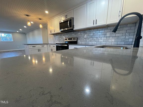 Completely renovated 2 bedroom home in downtown Angier! A great home or investment property with new HVAC, all new windows and doors, new pex plumbing & electrical & brand new roof! A gorgeous new kitchen with quartz counter tops, stainless steal appliances, modern black hardware and tons of cabinet space is a wonderful place to gather. The open floor plan, extra large closets and additional laundry room in the back have really made this 1066 sqft home feel spacious! The revamped tub, designer tile and expanded vanity add to the modern look and upgraded feel of this newly renovated home, plus prewired with Cat5. Out back enjoy a nice evening on the patio and no need to worry about extra space with the additional shed to store all the extras. What a great addition to your Christmas list!