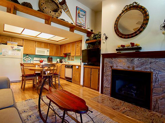 Fantastic Copperchase 1 Bedroom/1 bath condo with vaulted ceilings and great sunlight! West facing views of the forest and surrounding mountains. No better place on the mountain to enjoy a peaceful getaway with charming decor. Couch in living room is a sleeper sofa so you can fit 4 people comfortably. Laminate wood floor in living room and kitchen, carpet in the bedroom, and granite tile around the gas fireplace. Ceiling fans in both living room and bedroom with a jetted tub in Master bath. You can even ski in - ski out from the top of chair 6 from this condo! This condo has newer windows that save on the heating bills AND a private oak storage closet on the entry landing.