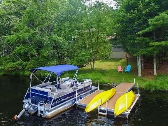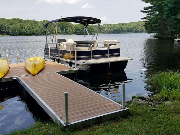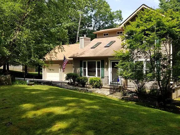 LAKEFRONT! This beautiful contemporary home located on a 90 acre private lake has 3brs, 2baths, loft, Pocono room and finished basement. Updated kitchen, Brazilian Cherry hardwood floors, 2 stone fireplaces, vaulted ceilings, eat-in kitchen, 2 car attached garage with extra wide doors. Outside there is a private dock, utility shed, and partially fenced yard. The home has central air conditioning, fully paved driveway, home security cameras and smart thermostat. There is also a community pool within a short walk., Baths: 1 Bath Level 1, Baths: 1 Bath Level 2, Beds Description: Primary1st