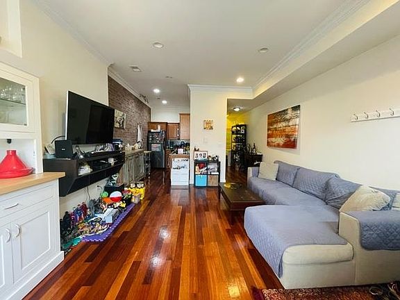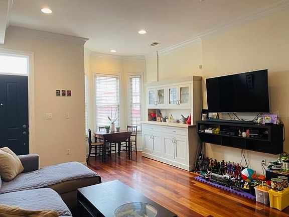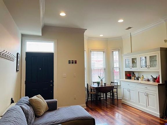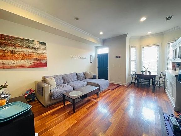 Nestled in the vibrant Jersey City Heights, this bright and beautiful 1380-square-foot brownstone duplex offers a delightful blend of historic charm and modern living. Featuring two oversized bedrooms and 1.5 bathrooms, the spacious layout provides ample room to relax and entertain. Sunlight streams through the windows, illuminating the wide plank Kempas hardwood floors and recessed lighting that enhance the home's warm ambiance. The massive open-concept living and dining area seamlessly transitions into a chef's kitchen, equipped with stainless steel appliances, a stylish glass tile backsplash, and elegant under-cabinet lighting. Modern comforts like central A/C and an in-unit washer/dryer add to the convenience of this residence. For those with vehicles, reserved rental parking is available directly across the street. The location is ideal, with bus stops just a block away offering easy access to NYC, and the Franklin Street staircase leading down to Hoboken's 2nd Street Light Rail Station just three blocks away. Additionally, you'll find yourself just blocks from Palisade and Central Avenues, providing access to a variety of grocery and shopping options. Don't miss the chance to experience the unique charm of Jersey City Heights; schedule your private tour today.