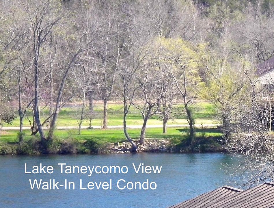 NO STEPS! Beautiful view of Lake Taneycomo. Very clean unit with newer carpet and laminate flooring. Custom-made drapes. Bedroom windows were recently replaced. Lots of storage: coat closet, pantry, deck closet, and cabinets in laundry room. Building has a new roof. Second level, but back entrance is level with second floor for walk-in convenience. Wonderful location, just minutes to shopping and medical facilities. Amenities include clubhouse, fishing dock, 3 pools, full-time maintenance, landscaped grounds, and boat launch. One owner must be 55 or older.