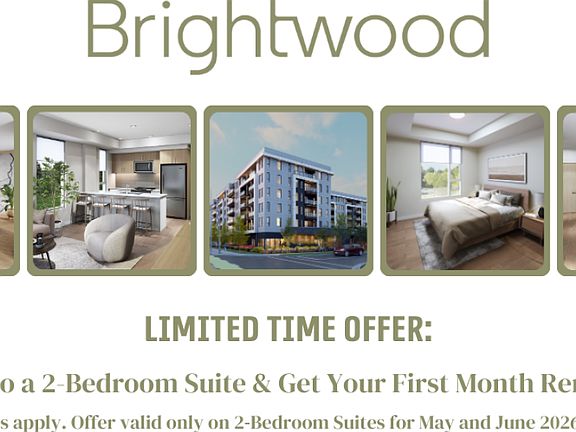 About*Conditions apply. Offer valid only on 2Bedroom Suites for May and June 2026 move-ins.Brightwood is a six-storey, 128-suite concrete and wood-constructed residence located in a well-established neighbourhood, offering the perfect balance of peaceful living and everyday convenience. Just minutes from major employment areas, the Manulife Sportsplex, and Conestoga MallWaterloo's largest shopping destinationresidents enjoy easy access to work, recreation, and retail.Each suite is thoughtfully designed for comfortable, modern living and features four full-size appliances, in-suite laundry, durable LVP flooring, window coverings, and sleek quartz countertops. Residents can also enjoy a range of shared amenities, including a welcoming common room, an outdoor terrace, and a fully equipped fitness room. Ground-floor commercial space adds extra convenience with everyday essentials just steps from home.Brightwood is also approximately 52% more energy efficient than a typical building, helping support long-term comfort and reduced environmental impact.