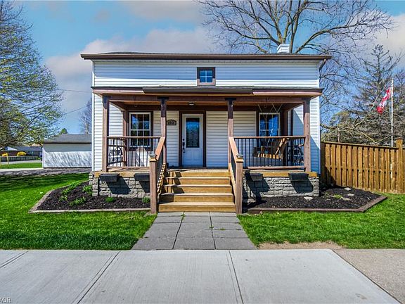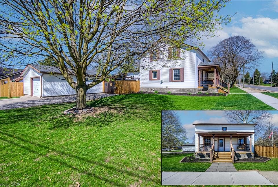 150 WOOLWICH STREET SOUTH – IN THE HEART OF BRESLAU, where tree-lined streets meet wide open skies, you’ll find this beautifully updated circa 1870s home—a home with story and soul, creating something truly special. Sitting proudly on a spacious .37-acre corner lot, this property offers room to breathe, room to grow, and a lifestyle that’s increasingly rare to find. From the moment you arrive, the wide asphalt driveway (2016) and the charming, newly rebuilt front porch with a cozy swing (2023) invite you to slow down and stay awhile. Inside, the main floor unfolds with a bright and welcoming layout: a cozy dining area, an inviting living room, a sun-filled kitchen, and an updated 4pc bathroom. At the heart of the home, a sunroom with stunning exposed beams adds warmth, character, and the perfect gathering spot for family and friends. Upstairs, 2 comfortable bedrooms and a 3pc bathroom provide a peaceful retreat from the day. Step outside and discover a backyard designed for living. Fully fenced (new privacy fence added in 2019) and beautifully oversized, this lush green space is ready for summer barbecues, backyard games, gardening dreams, or quiet afternoons under the gazebo. The rebuilt covered deck (2019) makes outdoor living a year-round pleasure. For those who love to create, build, or simply need extra space, the oversized detached 1.5 garage (40AMP) and powered workshop (added in 2022) are ready to bring your projects to life. Additional updates include AC (2024), furnace (2013), and roof (2008). Perfectly located just minutes from Kitchener, Cambridge, and quick 401 access, Breslau offers the best of both worlds—easy commuting and a welcoming, small-town feel that’s becoming harder to find.